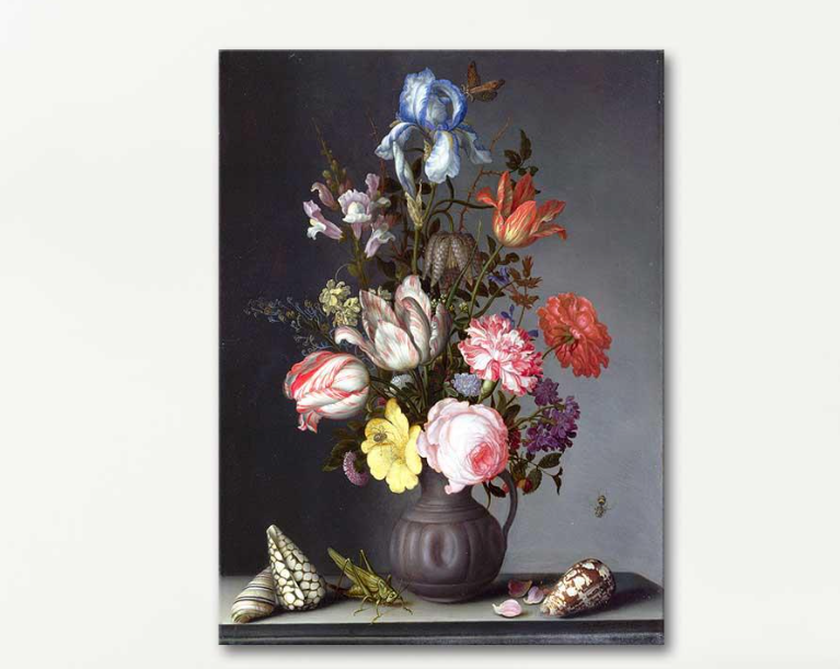 Balthasar van der Ast’in ‘Vazoda Çiçekler Böcek ve İstiridye Kabuğu’ (Flowers in a Vase with Shells and Insects) adlı eserinin kanvas baskı tablosu. Eserin orjinali özel bir koleksiyonda bulunmaktadır.