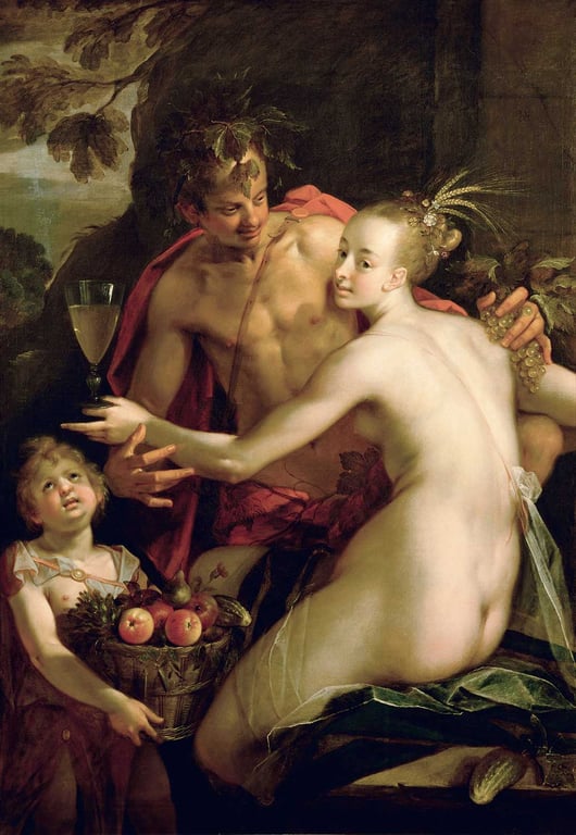 Hans von Aachen’in ‘Bacchus, Ceres and Amor’ (Bacchus Ceres Cupid) adlı eserinin kanvas baskı tablosu. Eserin orijinali Viyana Sanat Tarihi Müzesi’nde bulunmaktadır.